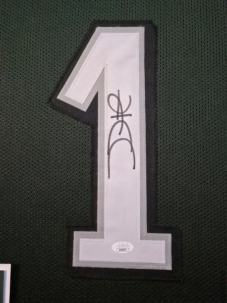 Custom Framed Jalen Hurts NUMBER 1 hand signed Philadelphia Eagles style custom jersey.JSA COA The authentication is from JSA. This signature is authenticated a representative of JSA! 100% AUTHENTIC!!! The jersey has fully stitched numbers on the front and back. It is a great item and a must for all great sports fans! This item is professionally framed, it measures 32"x40" inside , 42"x34" outside , using UV protective Acrylic glass for safe keeping and safe transport, team color matting, black moulding and hanging hooks on the back. All additional items in frame seen in pictures included. 100% ready to hang in your fan cave.