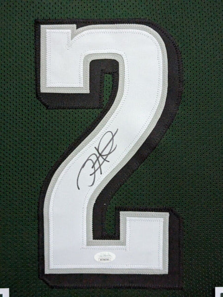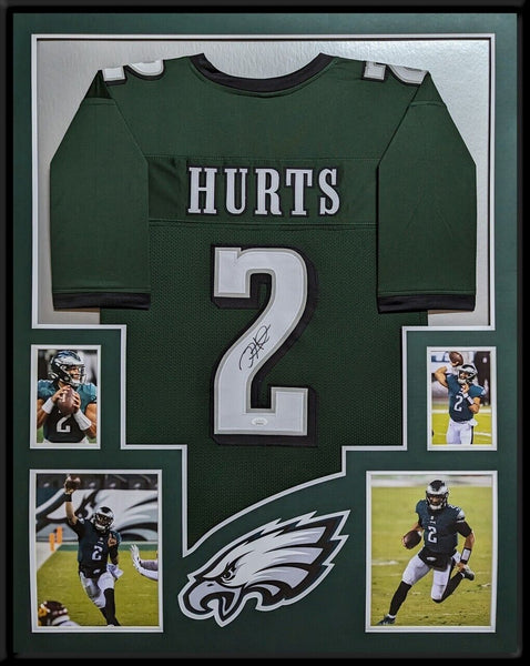 Custom Framed Jalen Hurts NUMBER 2 hand signed Philadelphia Eagles style custom jersey.JSA COA The authentication is from JSA. This signature is authenticated a representative of JSA! 100% AUTHENTIC!!! The jersey has fully stitched numbers on the front and back. It is a great item and a must for all great sports fans! This item is professionally framed, it measures 32"x40" inside , 42"x34" outside , using UV protective Acrylic glass for safe keeping and safe transport, team color matting, black moulding and hanging hooks on the back. All additional items in frame seen in pictures included. 100% ready to hang in your fan cave.