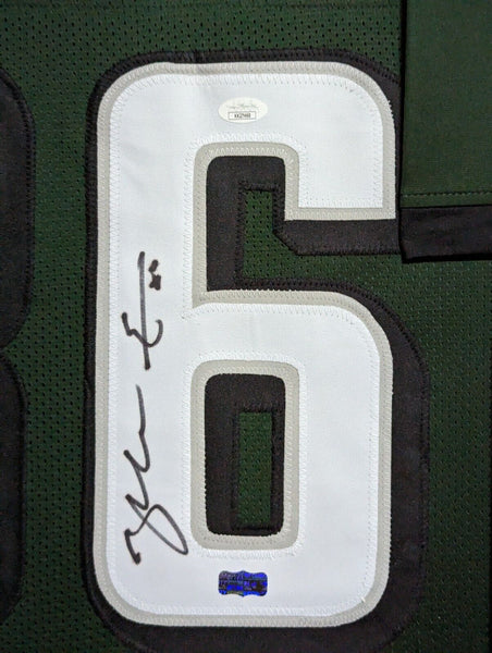 Custom Framed Zach Ertz hand signed Philadelphia Eagles style custom jersey.JSA Hologram and COAThe authentication is from JSA. This signature is WITNESSED by a representative of JSA! 100% AUTHENTIC!!! The jersey has fully stitched numbers on the front and back. It is a great item and a must for all great sports fans!Stock photos are used for auctions. Will receive equal qualityThis item is professionally framed, it measures 32"x40" inside , 42"x34" outside , using UV protective Acrylic glass for safe keeping and safe transport, team color matting, black moulding and hanging hooks on the back. All additional items in frame seen in pictures included. 100% ready to hang in your fan cave.