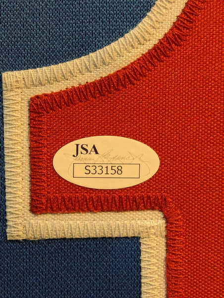 Custom Framed Darren Daulton hand signed Philadelphia Phillies style custom jersey.The authentication is from JSA. This signature is WITNESSED by a representative of JSA! 100% AUTHENTIC!!! The jersey has fully stitched numbers on the front and back. It is a great item and a must for all great sports fans!This item is professionally framed, it measures 32"x40" inside , 42"x34" outside , using UV protective Acrylic glass for safe keeping and safe transport, team color matting, black moulding and hanging hooks on the back. All additional items in frame seen in pictures included. 100% ready to hang in your fan cave.