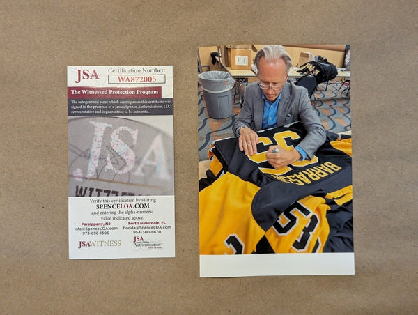 Custom Framed Tom Barrasso hand signed Pittsburgh Penguins style custom jersey. JSA Hologram and COA with photo of signing taking place The authentication is from JSA. This signature is WITNESSED by a representative of JSA! 100% AUTHENTIC!!! The jersey has fully stitched numbers on the front and back. It is a great item and a must for all great sports fans! This item is professionally framed, it measures 32"x40" inside , 42"x34" outside , using UV protective Acrylic glass for safe keeping and safe transport, team color matting, black moulding and hanging hooks on the back. All additional items in frame seen in pictures included. 100% ready to hang in your fan cave.