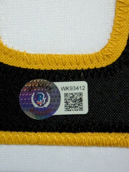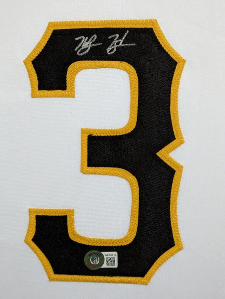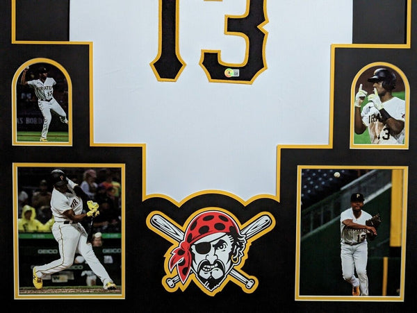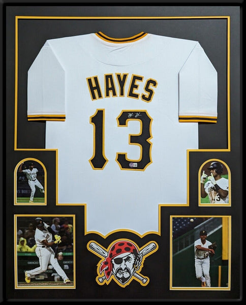 Custom Framed Ke'Bryan Hayes hand signed Pittsburgh Pirates style custom jersey.Beckett HologramThe authentication is from Beckett. This signature is WITNESSED by a representative of Beckett! 100% AUTHENTIC!!! The jersey has fully stitched numbers on the front and back. It is a great item and a must for all great sports fans!This item is professionally framed, it measures 32"x40" inside , 42"x34" outside , using UV protective Acrylic glass for safe keeping and safe transport, team color matting, black moulding and hanging hooks on the back. All additional items in frame seen in pictures included. 100% ready to hang in your fan cave.