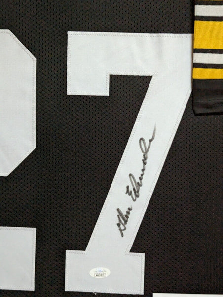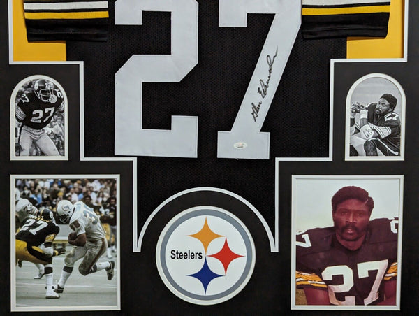 Custom Framed Glen Edwards hand signed Pittsburgh Steelers style custom jersey.JSA Hologram and COAThe authentication is from JSA. This signature is WITNESSED by a representative of JSA! 100% AUTHENTIC!!! The jersey has fully stitched numbers on the front and back. It is a great item and a must for all great sports fans!Stock photos are used for auctions. Will receive equal quality.This item is professionally framed, it measures 32"x40" inside , 42"x34" outside , using UV protective Acrylic glass for safe keeping and safe transport, team color matting, black moulding and hanging hooks on the back. All additional items in frame seen in pictures included. 100% ready to hang in your fan cave.