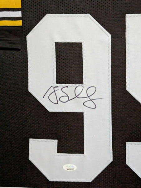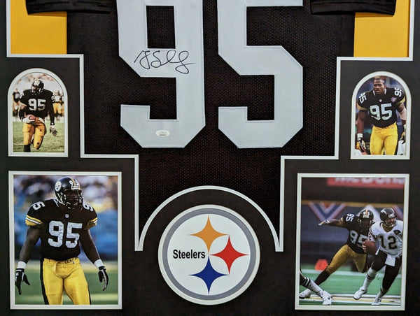 Custom Framed Greg Lloyd hand signed Pittsburgh Steelers style custom jersey.JSA Hologram and COAThe authentication is from JSA. This signature is WITNESSED by a representative of JSA! 100% AUTHENTIC!!! The jersey has fully stitched numbers on the front and back. It is a great item and a must for all great sports fans!This item is professionally framed, it measures 32"x40" inside , 42"x34" outside , using UV protective Acrylic glass for safe keeping and safe transport, team color matting, black moulding and hanging hooks on the back. All additional items in frame seen in pictures included. 100% ready to hang in your fan cave.