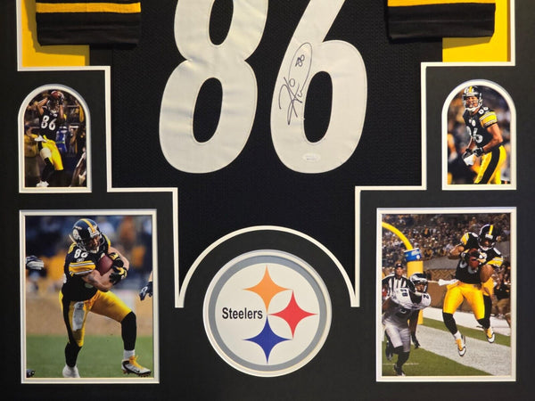 Custom Framed Hines Ward signed Pittsburgh Steelers style custom jersey.JSA Hologram and COAThe authentication is from JSA. This signature is WITNESSED by a representative of JSA! 100% AUTHENTIC!!! The jersey has fully stitched numbers on the front and back. It is a great item and a must for all great sports fans!This item is professionally framed, it measures 32"x40" inside , 42"x34" outside , using UV protective Acrylic glass for safe keeping and safe transport, team color matting, black moulding and hanging hooks on the back. All additional items in frame seen in pictures included. 100% ready to hang in your fan cave.