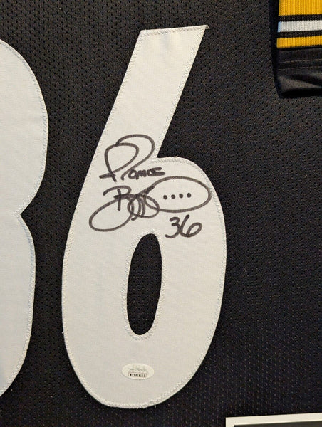 Custom Framed Jerome Bettis hand signed Pittsburgh Steelers style custom jersey.JSA COAThe authentication is from JSA. This signature is WITNESSED by a representative of JSA! 100% AUTHENTIC!!! The jersey has fully stitched numbers on the front and back. It is a great item and a must for all great sports fans!Stock photos are used for auctions. Will receive equal quality.This item is professionally framed, it measures 32"x40" inside , 42"x34" outside , using UV protective Acrylic glass for safe keeping and safe transport, team color matting, black moulding and hanging hooks on the back. All additional items in frame seen in pictures included. 100% ready to hang in your fan cave.