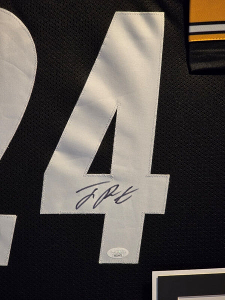 Custom Framed Joey Porter Jr signed Pittsburgh Steelers style custom jersey.JSA Hologram and COAThe authentication is from JSA. This signature is WITNESSED by a representative of JSA! 100% AUTHENTIC!!! The jersey has fully stitched numbers on the front and back. It is a great item and a must for all great sports fans!This item is professionally framed, it measures 32"x40" inside , 42"x34" outside , using UV protective Acrylic glass for safe keeping and safe transport, team color matting, black moulding and hanging hooks on the back. All additional items in frame seen in pictures included. 100% ready to hang in your fan cave.