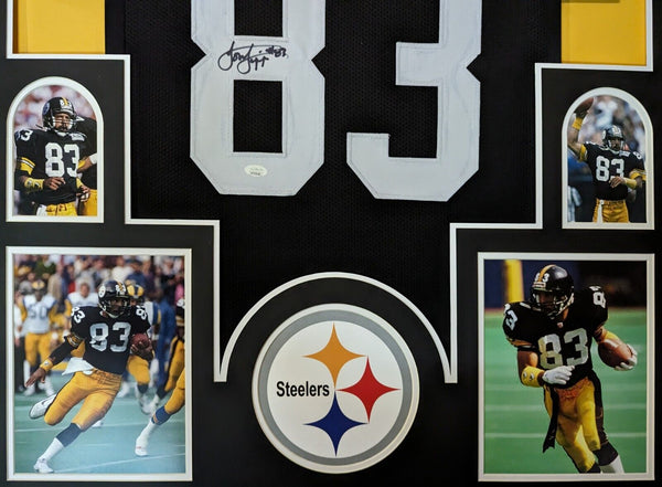 Custom Framed Louis Lipps hand signed Pittsburgh Steelers style custom jersey.JSA Hologram and COAThe authentication is from JSA. This signature is WITNESSED by a representative of JSA! 100% AUTHENTIC!!! The jersey has fully stitched numbers on the front and back. It is a great item and a must for all great sports fans!Stock photos are used for auctions. Will receive equal quality.This item is professionally framed, it measures 32"x40" inside , 42"x34" outside , using UV protective Acrylic glass for safe keeping and safe transport, team color matting, black moulding and hanging hooks on the back. All additional items in frame seen in pictures included. 100% ready to hang in your fan cave.