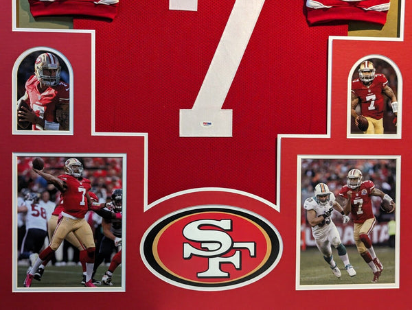 Framed Colin Kaepernick signed San Francisco 49ers style Custom Jersey. PSA HOLO The authentication is from PSA. This signature is authenticated by a representative of PSA! 100% AUTHENTIC!!! The jersey has fully stitched numbers on the front and back. No tags or logos. This is not an official NFL jersey but it is very high quality. It is a great item and a must for all great sports fans! This item is professionally framed, it measures 32"x40" inside , 42"x34" outside , using UV protective Acrylic glass for safe keeping and safe transport, team color matting, black moulding and hanging hooks on the back. All additional items in frame seen in pictures included. 100% ready to hang in your fan cave.