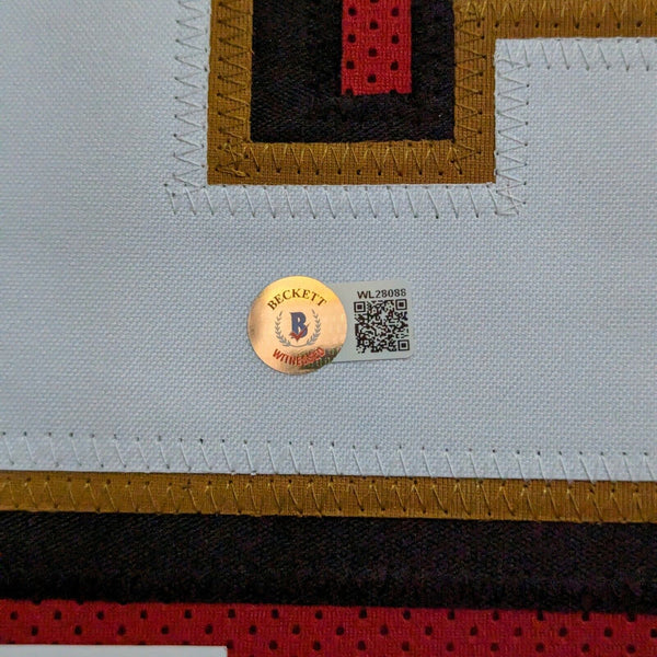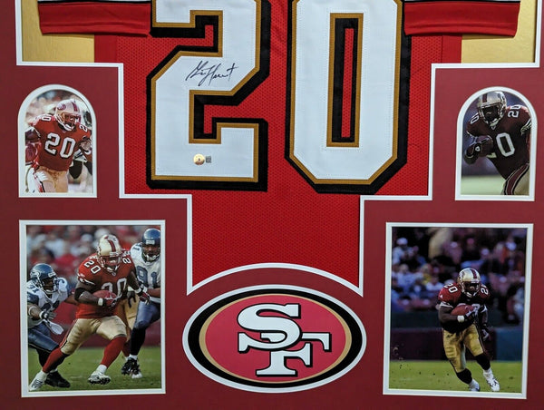 Custom Framed Garrison Hearst hand signed San Francisco 49ers style custom jersey.Beckett HologramThe authentication is from Beckett. This signature is witness authenticated by a representative of Beckett! 100% AUTHENTIC!!! The jersey has fully stitched numbers on the front and back. It is a great item and a must for all great sports fansThis item is professionally framed, it measures 32"x40" inside , 42"x34" outside , using UV protective Acrylic glass for safe keeping and safe transport, team color matting, black moulding and hanging hooks on the back. All additional items in frame seen in pictures included. 100% ready to hang in your fan cave.