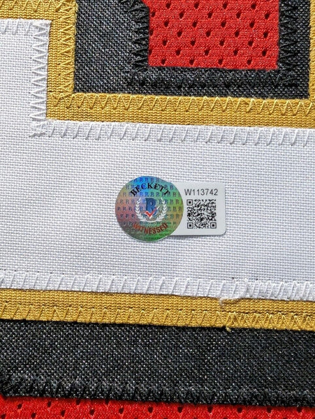 Framed Jeff Garcia signed San Francisco style Custom Jersey. Beckett Hologram The authentication is from Beckett. This signature is authenticated by a representative of Beckett! 100% AUTHENTIC!!! The jersey has fully stitched numbers on the front and back. No tags or logos. This is not an official NFL jersey but it is very high quality. It is a great item and a must for all great sports fans! This item is professionally framed, it measures 32"x40" inside , 42"x34" outside , using UV protective Acrylic glass for safe keeping and safe transport, team color matting, black moulding and hanging hooks on the back. All additional items in frame seen in pictures included. 100% ready to hang in your fan cave.