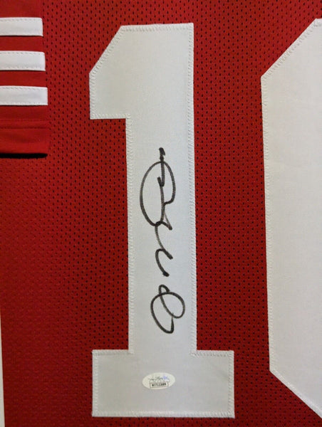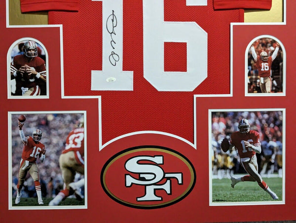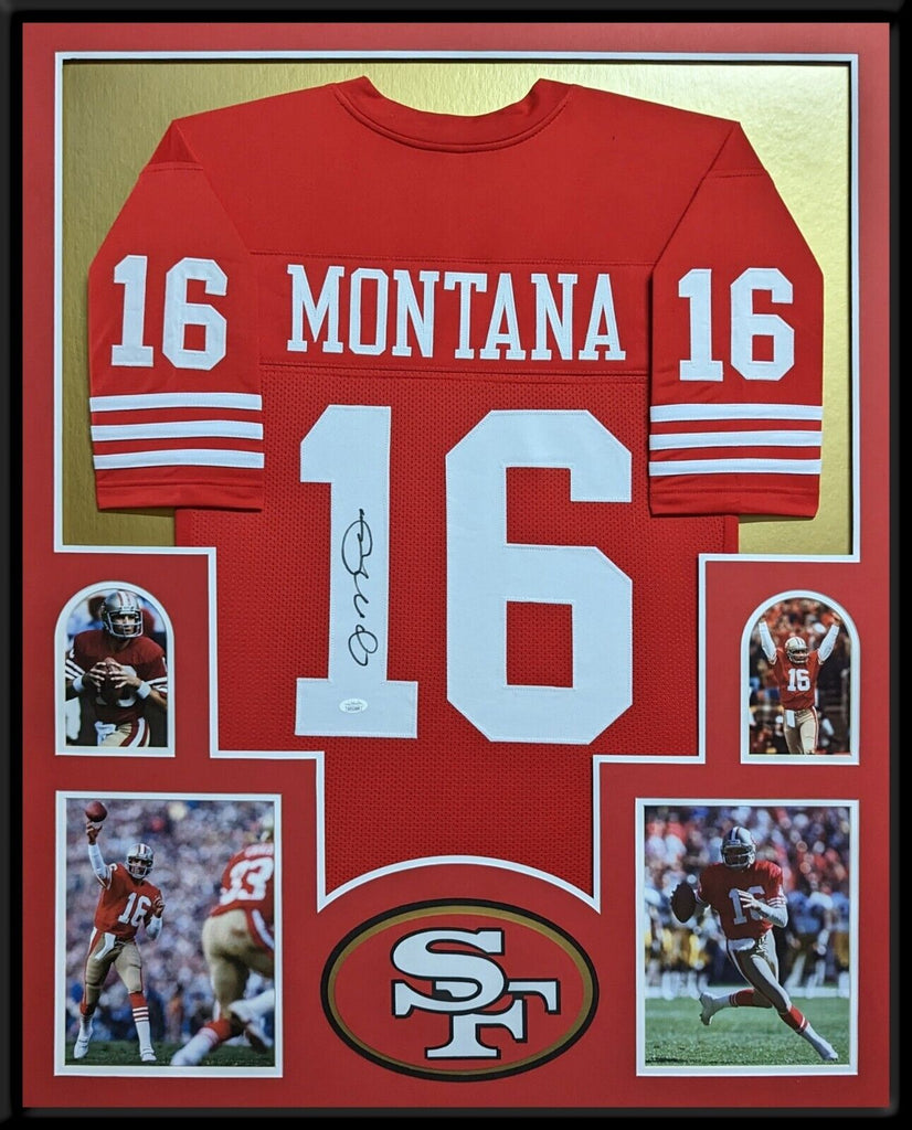 Custom Framed Joe Montana hand signed San Francisco 49ers style custom jersey.JSA Hologram and COAThe authentication is from JSA. This signature is WITNESSED by a representative of JSA! 100% AUTHENTIC!!! The jersey has fully stitched numbers on the front and back. It is a great item and a must for all great sports fans!Stock photos are used for auctions. Will receive equal quality.This item is professionally framed, it measures 32"x40" inside , 42"x34" outside , using UV protective Acrylic glass for safe keeping and safe transport, team color matting, black moulding and hanging hooks on the back. All additional items in frame seen in pictures included. 100% ready to hang in your fan cave.
