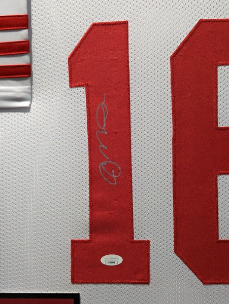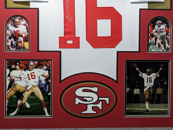 Custom Framed Joe Montana hand signed San Francisco 49ers style custom jersey.JSA Hologram and COAThe authentication is from JSA. This signature is WITNESSED by a representative of JSA! 100% AUTHENTIC!!! The jersey has fully stitched numbers on the front and back. It is a great item and a must for all great sports fans!Stock photos are used for auctions. Will receive equal quality.This item is professionally framed, it measures 32"x40" inside , 42"x34" outside , using UV protective Acrylic glass for safe keeping and safe transport, team color matting, black moulding and hanging hooks on the back. All additional items in frame seen in pictures included. 100% ready to hang in your fan cave.