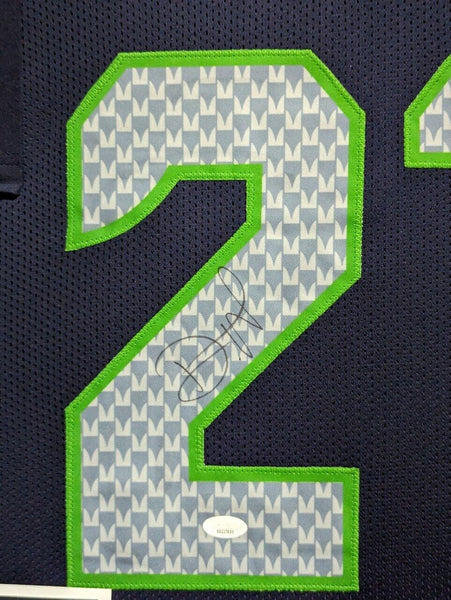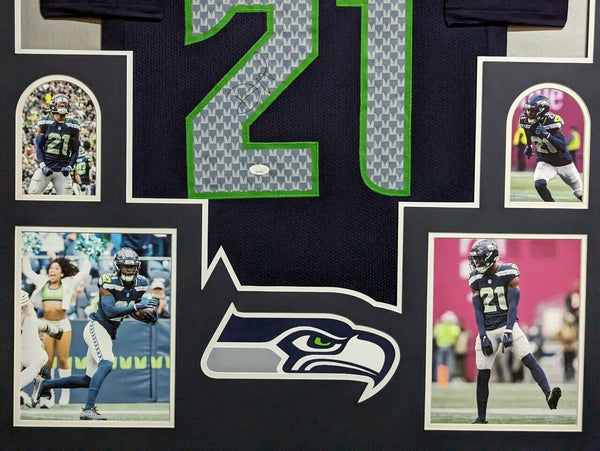 Custom Framed Devon Witherspoon hand signed Seattle Seahawks style custom jersey.JSA Hologram and COAThe authentication is from JSA. This signature is WITNESSED by a representative of JSA! 100% AUTHENTIC!!! The jersey has fully stitched numbers on the front and back. It is a great item and a must for all great sports fans!Stock photos are used for auctions. Will receive equal quality.This item is professionally framed, it measures 32"x40" inside , 42"x34" outside , using UV protective Acrylic glass for safe keeping and safe transport, team color matting, black moulding and hanging hooks on the back. All additional items in frame seen in pictures included. 100% ready to hang in your fan cave.