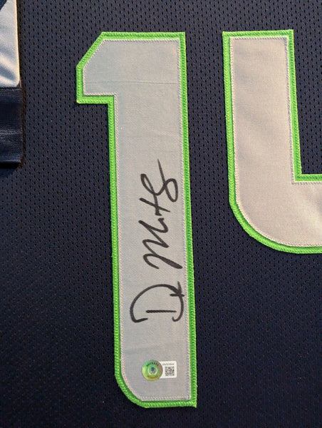 Custom Framed DK Metcalf hand signed Seattle Seahawks style custom jersey.Beckett HologramThe authentication is from Beckett. This signature is WITNESSED by a representative of Beckett! 100% AUTHENTIC!!! The jersey has fully stitched numbers on the front and back. It is a great item and a must for all great sports fans!Stock photos are used for auctions. Will receive equal quality.This item is professionally framed, it measures 32"x40" inside , 42"x34" outside , using UV protective Acrylic glass for safe keeping and safe transport, team color matting, black moulding and hanging hooks on the back. All additional items in frame seen in pictures included. 100% ready to hang in your fan cave.