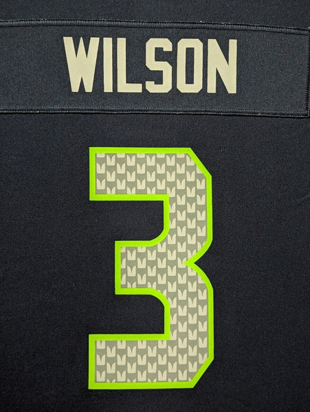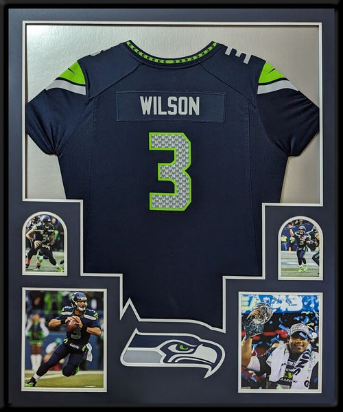 Custom Framed Russell Wilson Seattle Seahawks jersey displayThis item is professionally framed, it measures 32"x40" inside , 42"x34" outside , using UV protective Acrylic glass for safe keeping and safe transport, team color matting, black moulding and hanging hooks on the back. All additional items in frame seen in pictures included. 100% ready to hang in your fan cave.