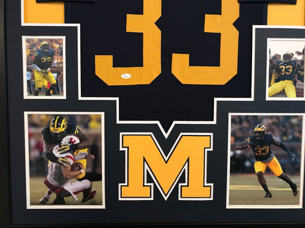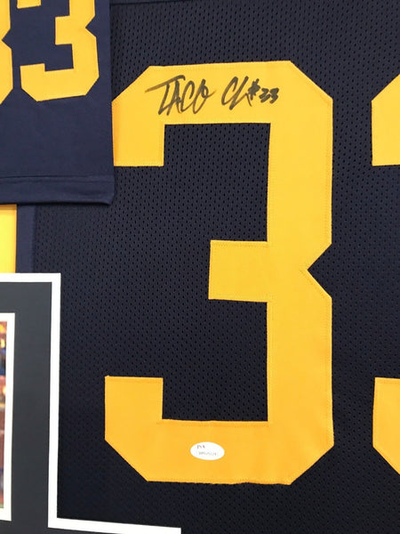 Custom Framed Taco Charlton hand signed Michigan Wolverines jersey.JSA Hologram and COA(#WP620224)The authentication is from JSA. This signature is authenticated by a representative of JSA! 100% AUTHENTIC!!! The jersey has fully stitched numbers on the front and back. It is a great item and a must for all great sports fans!This item is professionally framed, it measures 32"x40" inside , 42"x34" outside , using UV protective Acrylic glass for safe keeping and safe transport, team color matting, black moulding and hanging hooks on the back. All additional items in frame seen in pictures included. 100% ready to hang in your fan cave.