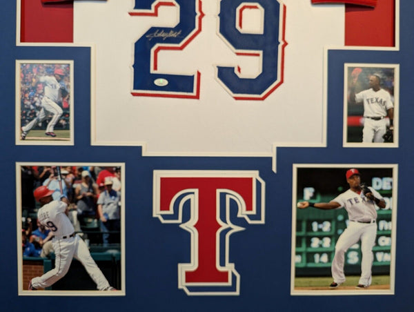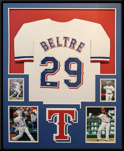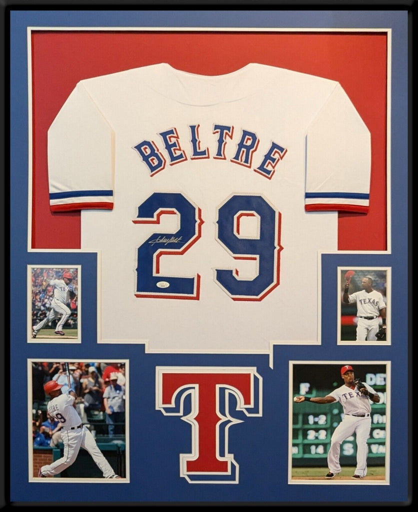 Custom Framed Adrian Beltre hand signed Texas Rangers style custom jersey.JSA Hologram and COAThe authentication is from JSA. This signature is authenticated by a representative of JSA! 100% AUTHENTIC!!! The jersey has fully stitched numbers on the front and back. It is a great item and a must for all great sports fans!This item is professionally framed, it measures 32"x40" inside , 42"x34" outside , using UV protective Acrylic glass for safe keeping and safe transport, team color matting, black moulding and hanging hooks on the back. All additional items in frame seen in pictures included. 100% ready to hang in your fan cave.