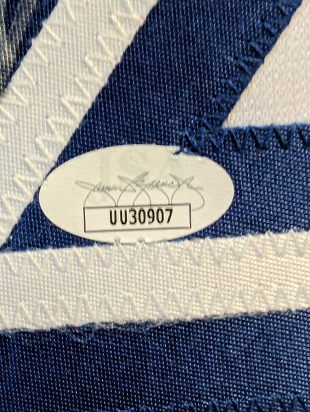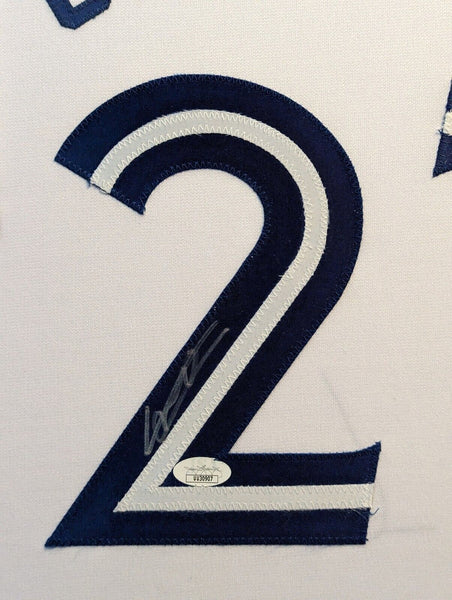 Custom Framed Vlad Guerrero hand signed Toronto Blue Jays style custom jersey.JSA Hologram and COAThe authentication is from JSA. This signature is authenticated by a representative of JSA! 100% AUTHENTIC!!! The jersey has fully stitched numbers on the front and back. It is a great item and a must for all great sports fans!This item is professionally framed, it measures 32"x40" inside , 42"x34" outside , using UV protective Acrylic glass for safe keeping and safe transport, team color matting, black moulding and hanging hooks on the back. All additional items in frame seen in pictures included. 100% ready to hang in your fan cave.