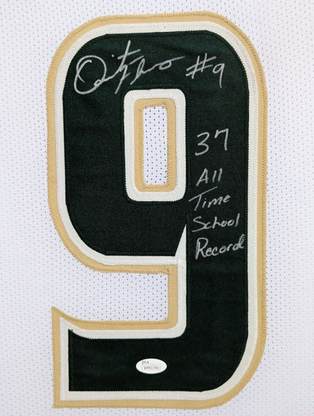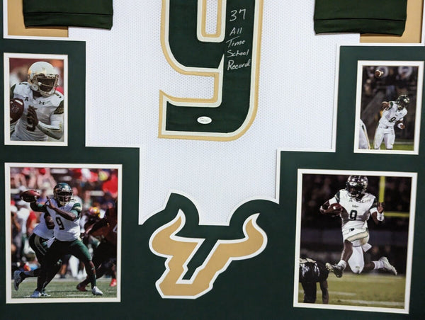 Custom Framed Quinton Flowers hand signed USF Bulls style custom jersey."37 All Time School Record" InscribedJSA COAThe authentication is from JSA. This signature is WITNESS authenticated by a representative of JSA! 100% AUTHENTIC!!! The jersey has fully stitched numbers on the front and back. It is a great item and a must for all great sports fans!This item is professionally framed, it measures 32"x40" inside , 42"x34" outside , using UV protective Acrylic glass for safe keeping and safe transport, team color matting, black moulding and hanging hooks on the back. All additional items in frame seen in pictures included. 100% ready to hang in your fan cave.