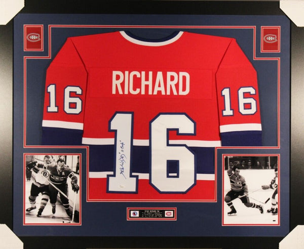 Custom framed jersey display measures 35.5" x 43.5" in size and has been hand-signed in blue felt-tip pen by Henri Richard (HOF).The autograph includes an official James Spence Authentication (JSA) hologram with matching COA for authenticity purposes. Authentication: JSA COA