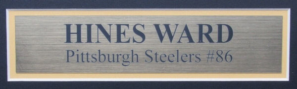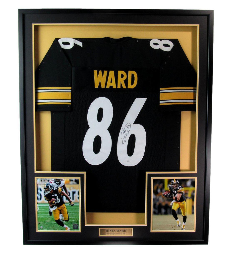 Hines ward autographed football jersey with photos pittsburgh steelers framed. this item is professionally framed using a wooden shadow box "frame" measuring 1 3/4 by 3/4 . outside dimensions are approximately 41x33. wire attached to easily place on your wall. item will be securely shipped using ups ground. please email with any further questions. this jersey is authenticated by jsa and includes their tamper-proof hologram sticker and certificate of authenticity.