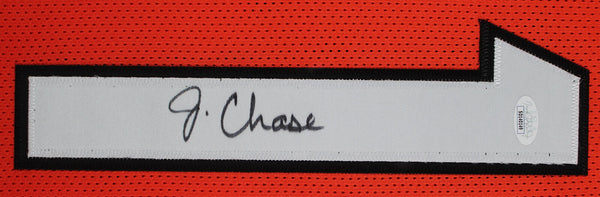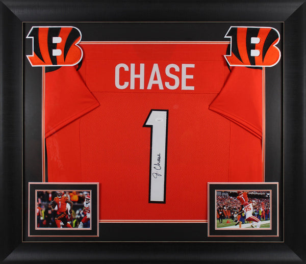 This Autographed Orange Pro Style Framed Jersey has been Personally Signed by Ja'Marr Chase of the Cincinnati Bengals. This item is 100% Authentic to include a hologram by Beckett Authentication Services or James Spence Authentication. This item may come with the new Beckett Authentication hologram that has a scannable QR code rather than the traditional COA. If you would like to have a COA, you are welcome to reach out to Beckett for a printed certification once you receive your item. This is a BAS/JSA Witnessed Protection Program item which means a Beckett/JSA Authentication Service representative was present when this item was being signed. We conducted an autograph signing with Ja'Marr Chase where multiples of the same item were signed. While the photographs are representative of this item, the size, placement and strength of the signature may vary. Each item is hand signed, therefore, each autograph is unique. This item can be verified through BAS or JSA site depending on the variant you receive. This is a X-Large sized, non-branded, custom-stitched Framed Jersey. This jersey will be framed to order, it will take 3-4 days from purchase date for it to ship.