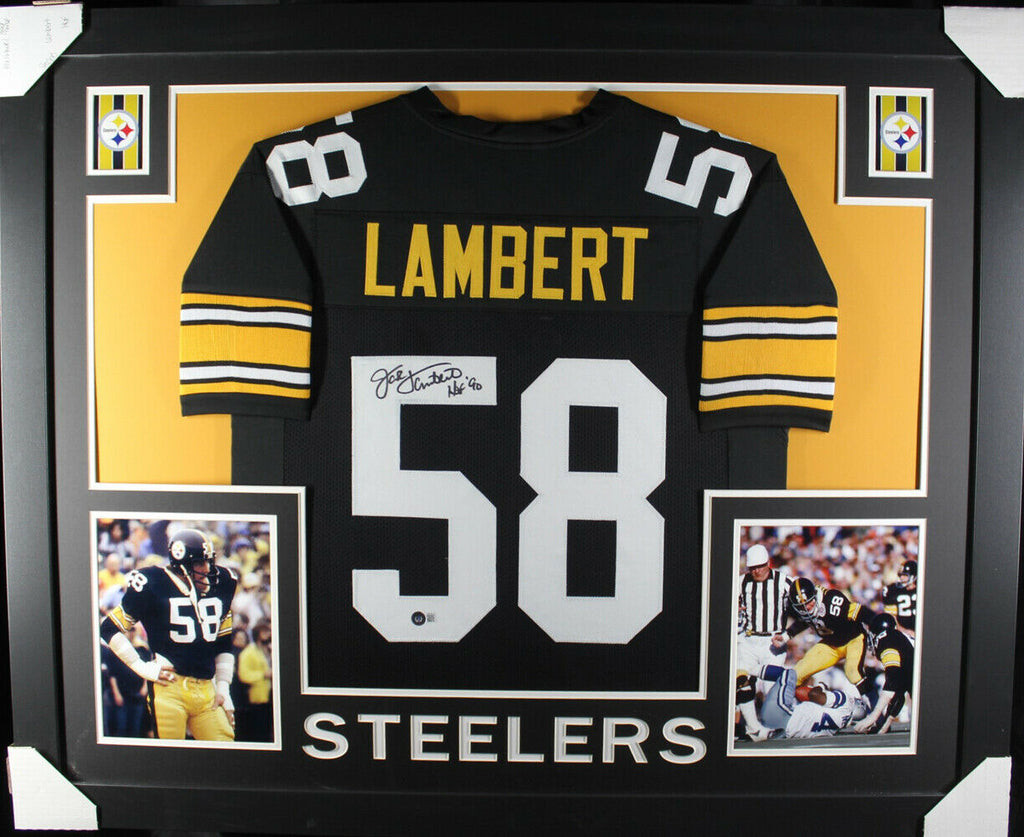 Jack Lambert Autographed/Signed Pro Style Framed Black XL Jersey Beckett 36212 The number in the listing title is just an inventory sku for our records and is not the authentication number. The item pictured is a stock photo unless otherwise noted. This is a professionally framed custom size black XL jersey with sewn on name and numbers that was personally autographed by Jack Lambert. This jersey measures approximately 42" x 34" and includes a certificate of authenticity from Beckett Authentication Services (BAS) and Denver Autographs.
