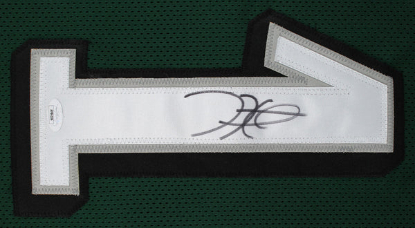 This Autographed Green Pro Style Framed Jersey has been Personally Signed by Jalen Hurts of the Philadelphia Eagles. This item is 100% Authentic to include a Certificate of Authenticity (COA) / hologram by JSA. We conducted an autograph signing with Jalen Hurts where multiples of the same item were signed. While the photographs are representative of this item, the size, placement and strength of the signature may vary. Each item is hand signed, therefore, each autograph is unique. This item can be verified through JSA. This item has been professionally framed to overall dimensions of approximately 32 x 37 inches. This is a X-Large sized, non-branded, custom-stitched Framed Jersey. This jersey will be framed to order, it will take 3-4 days from purchase date for it to ship.