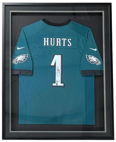 Featured is a Jalen Hurts signed Philadelphia Eagles Nike game replica jersey. This jersey was hand signed by Hurts and comes with the Beckett hologram and certificate of authenticity. This jersey is size XL. This jersey has been professionally framed and matted and is approximately 32x38. SPECIFICATIONS Autographed By: Jalen Hurts Team: Philadelphia Eagles Sport: Football-NFL Authentication: Beckett Grading Services