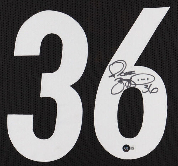 Custom frame measures approximately 35" x 43" in size and features a jersey that has been hand-signed by Jerome Bettis.The lot / autograph(s) includes an official Beckett Authentication Services serially-numbered hologram and QR Code card for authenticity purposes. The signing of this item was witnessed by Beckett.Authentication: Beckett QR Code card