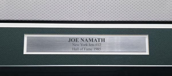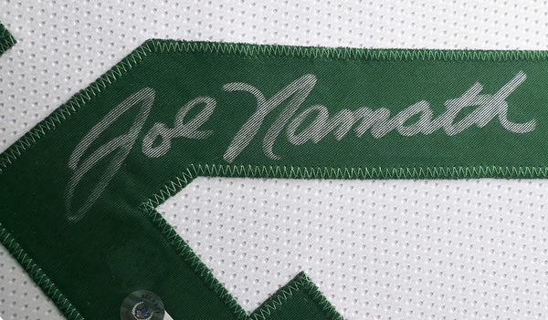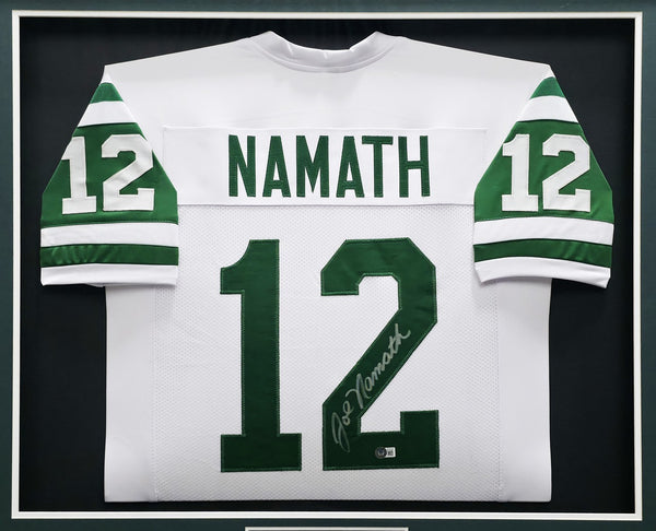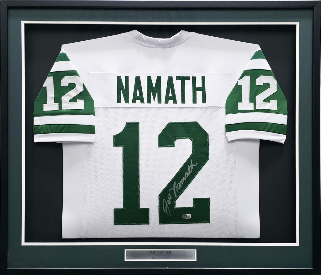 This is a framed White Jersey, approximately 31x36 with the frame, that has been hand signed by Joe Namath. Please note, there is a small chip in the frame. The jersey still displays nicely. This item has been witnessed and certified authentic by Beckett Authentication (BAS) and comes with their tamper-proof witness hologram.