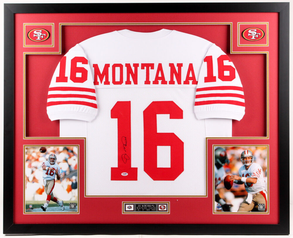 Custom frame measures approximately 34.5" x 42.5" in size. The display features a jersey that has been hand-signed in black felt-tip pen by Joe Montana (HOF). The display also includes (2) photos of Montana. The lot / autograph(s) includes an official PSA/DNA hologram and matching COA for authenticity purposes.Authentication: PSA COA