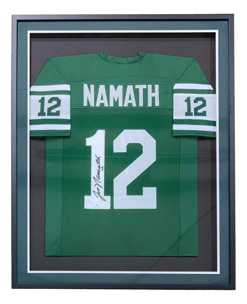 Featured is a Joe Namath signed custom football jersey. This jersey was hand signed by Namath and comes with the JSA hologram and certificate of authenticity. This jersey has professionally sewn letters and numbers and is size XL. This jersey has no team tags or emblems and is intended as a sports collectible. This jersey has been professionally framed and matted and is approximately 32x42. This jersey would make a great addition to any sports memorabilia collection! SPECIFICATIONS Autographed By: Joe Namath Team: New York Jets Sport: Football Authentication: James Spence Authentication (JSA)