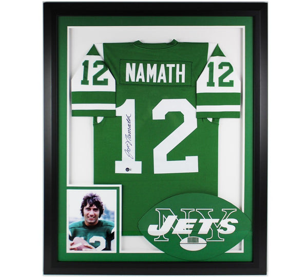 A New York Jets LED Framed Mitchell & Ness Authentic Green NFL Jersey hand signed by Joe Namath. The item and signature are in excellent condition. The framed measures approximately 34'' x 42''. Joe is a 4x AFL All-Star Selection, 1972 Pro Bowl Selection, Super Bowl III Champion and Most Valuable Player, and Class Of 1985 NFL Hall of Fame Inductee. AUTHENTICATION: The item is accompanied by a Beckett Serial Numbered and Databased Hologram