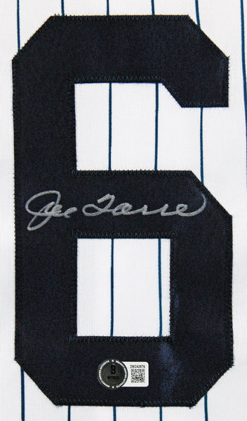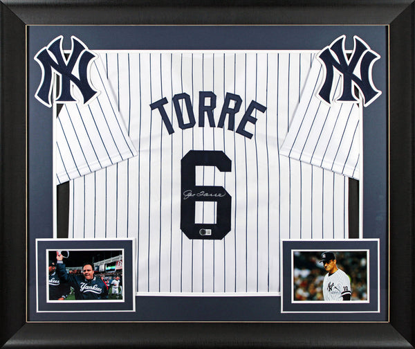 This Autographed White Pinstripe Pro Style Framed Jersey has been Personally Signed by Joe Torre of the New York Yankees. This item is 100% Authentic to include a hologram by Beckett Authentication Services. This item will come with an affixed Beckett Authentication Services (BAS) authentication sticker, which includes a scannable QR code to verify authenticity. Please note that Beckett no longer provides serial-numbered COA cards, and the attached BAS sticker will serve as the complete authentication for this item. This is a BAS Witnessed Protection Program item which means a Beckett Authentication Service representative was present when this item was being signed. We conducted an autograph signing with Joe Torre where multiples of the same item were signed. While the photographs are representative of this item, the size, placement and strength of the signature may vary. Each item is hand signed, therefore, each autograph is unique. This item can be verified through BAS Witnessed. This item has been professionally framed to overall dimensions of approximately 32 x 37 inches. This is a X-Large sized, non-branded, custom-stitched Framed Jersey. This jersey will be framed to order, it will take 3-4 days from purchase date for it to ship.