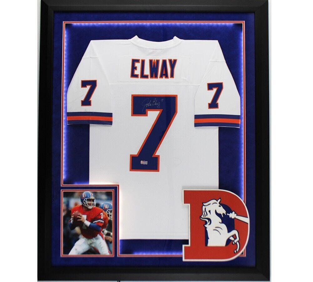 A Denver Broncos LED Framed Mitchell & Ness White NFL Jersey hand signed by John Elway. The item and signature are in excellent condition. The framed measures approximately 36x44 and features an 8x10 photo of John. John was drafted into the NFL in 1983 Round 1. He is a 2x Super Bowl Champion, a Super Bowl MVP and was the NFL Most Valuable Player in 1987. AUTHENTICATION: The item is accompanied by a Certificate of Authenticity - Serial Numbered and Databased Hologram