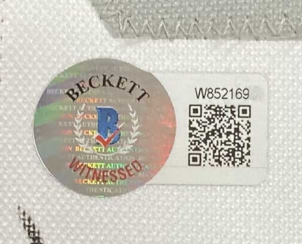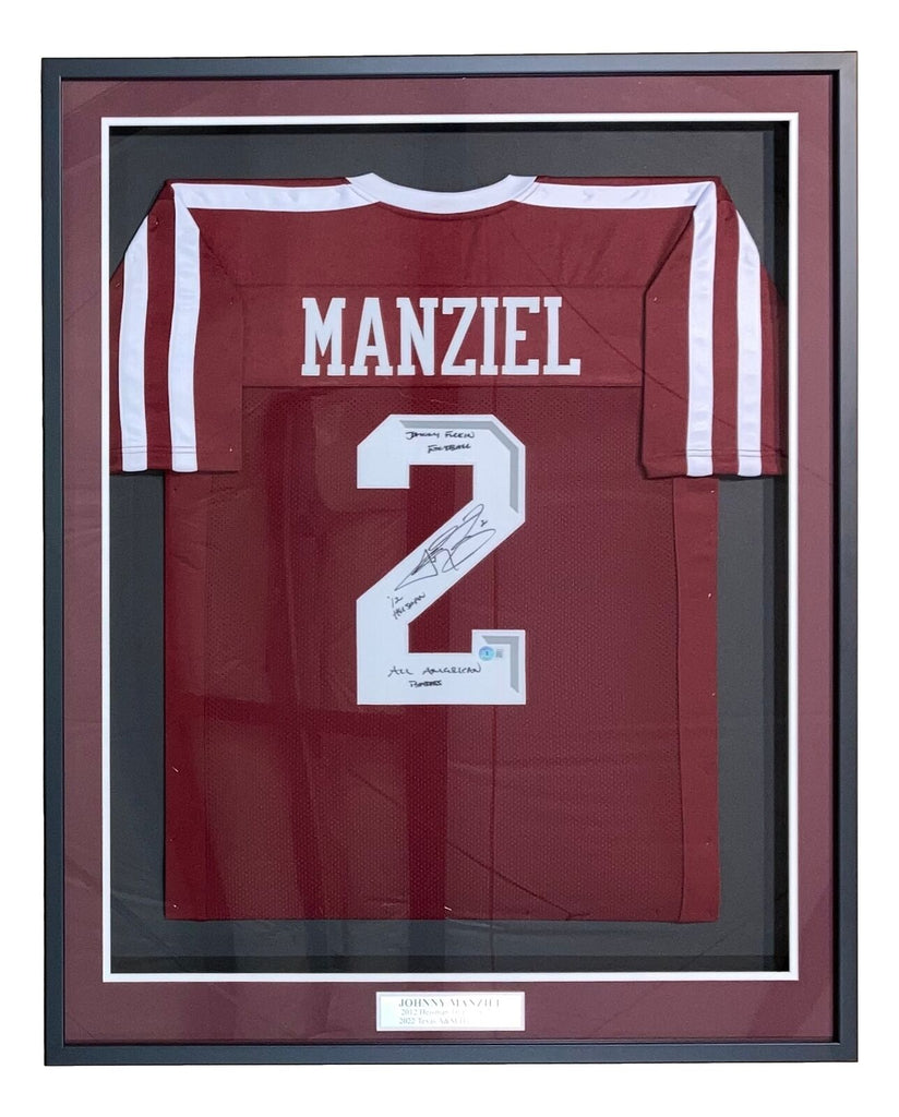Featured is a Johnny Manziel signed custom football jersey, inscribed "Johnny F...g Football", "12 Heisman", and "All American Bada..". This jersey has been hand signed by Manziel and comes with the Beckett witnessed hologram and certificate of authenticity. This jersey features professionally sewn letters and numbers and is size XL. This jersey has no team tags or emblems and is intended as a sports collectible. This jersey has been professionally framed and matted and is approximately 32x42. This jersey would make a great addition to any sports memorabilia collection! SPECIFICATIONS Autographed By: Johnny Manziel Team: Texas A&M Sport: Football Authentication: Beckett Grading Services