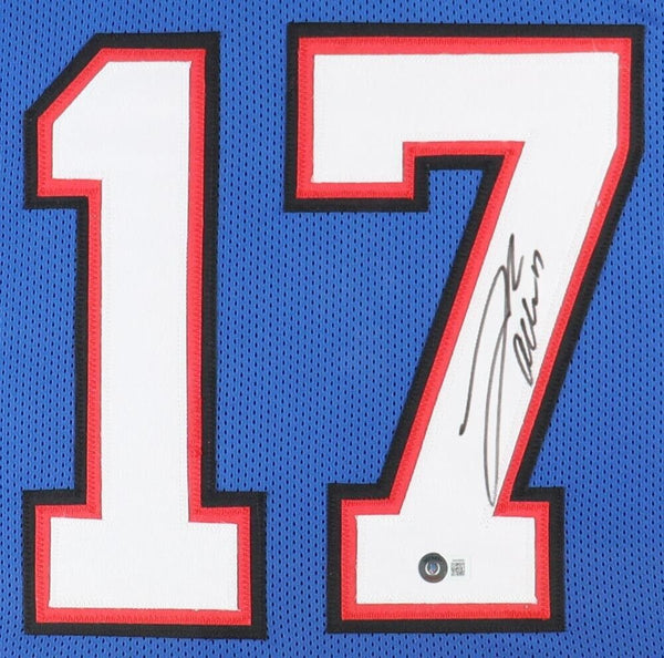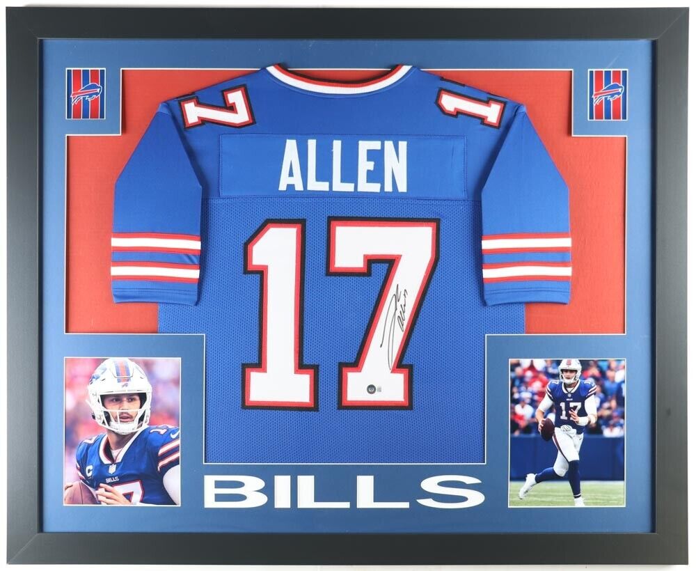 Custom frame measures 35" x 43" in size and features a jersey hand-signed by Josh Allen.The lot / autograph(s) includes an official Beckett Authentication Services serially-numbered hologram for authenticity purposes. The signing of this item was witnessed by Beckett.Authentication: Beckett Hologram