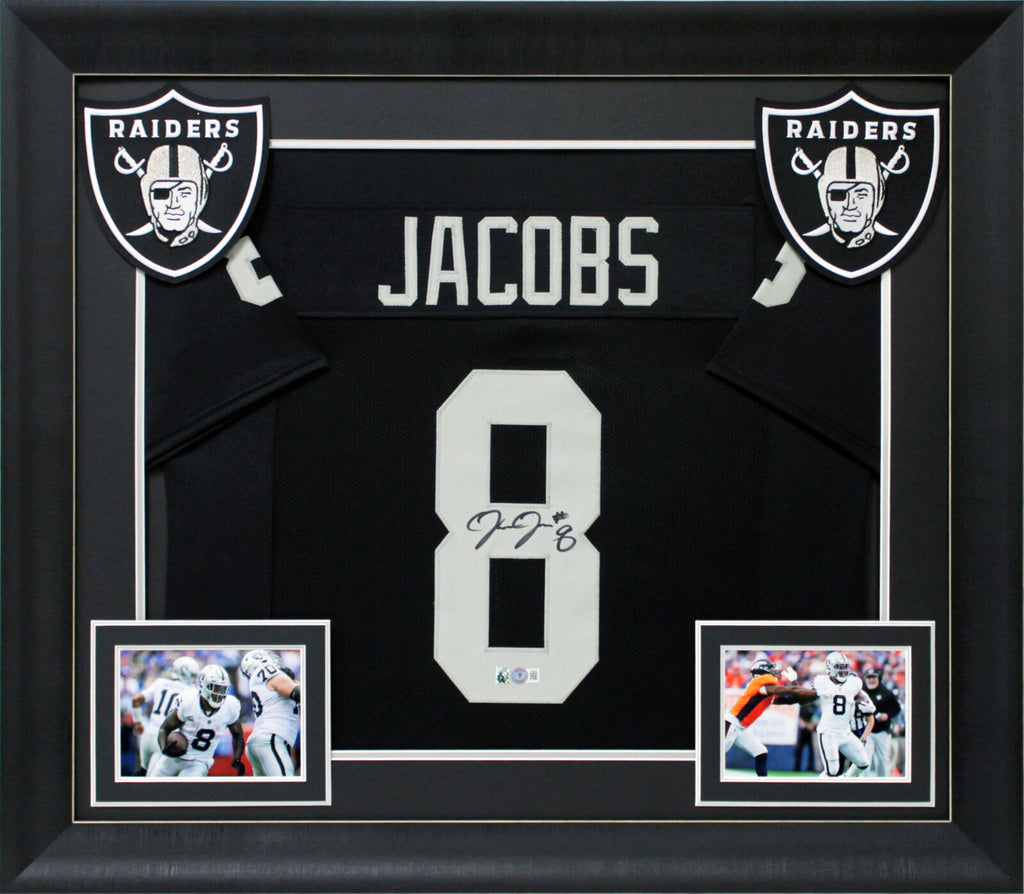 This Autographed Black Pro Style #8 Framed Jersey has been Personally Signed by Josh Jacobs of the Las Vegas Raiders. This item is 100% Authentic to include a hologram by Beckett Authentication Services. This item will come with an affixed Beckett Authentication Services (BAS) authentication sticker, which includes a scannable QR code to verify authenticity. Please note that Beckett no longer provides serial-numbered COA cards, and the attached BAS sticker will serve as the complete authentication for this item. This is a BAS Witnessed Protection Program item which means a Beckett Authentication Service representative was present when this item was being signed. We conducted an autograph signing with Josh Jacobs where multiples of the same item were signed. While the photographs are representative of this item, the size, placement and strength of the signature may vary. Each item is hand signed, therefore, each autograph is unique. This item can be verified through BAS Witnessed. This item has been professionally framed to overall dimensions of approximately 32 x 37 inches. This is a X-Large sized, non-branded, custom-stitched Framed Jersey. This jersey will be framed to order, it will take 3-4 days from purchase date for it to ship.