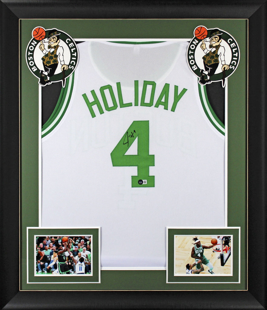 This Autographed White Pro Style Framed Jersey has been Personally Signed by Jrue Holiday of the Boston Celtics. This item is 100% Authentic to include a hologram by Beckett Authentication Services. This item will come with an affixed Beckett Authentication Services (BAS) authentication sticker, which includes a scannable QR code to verify authenticity. Please note that Beckett no longer provides serial-numbered COA cards, and the attached BAS sticker will serve as the complete authentication for this item. This is a BAS Witnessed Protection Program item which means a Beckett Authentication Service representative was present when this item was being signed. We conducted an autograph signing with Jrue Holiday where multiples of the same item were signed. While the photographs are representative of this item, the size, placement and strength of the signature may vary. Each item is hand signed, therefore, each autograph is unique. This item can be verified through BAS Witnessed. This item has been professionally framed to overall dimensions of approximately 32 x 37 inches. This is a X-Large sized, non-branded, custom-stitched Framed Jersey. These jerseys are framed to order, it takes approximately 3-4 business days for framing to be completed.