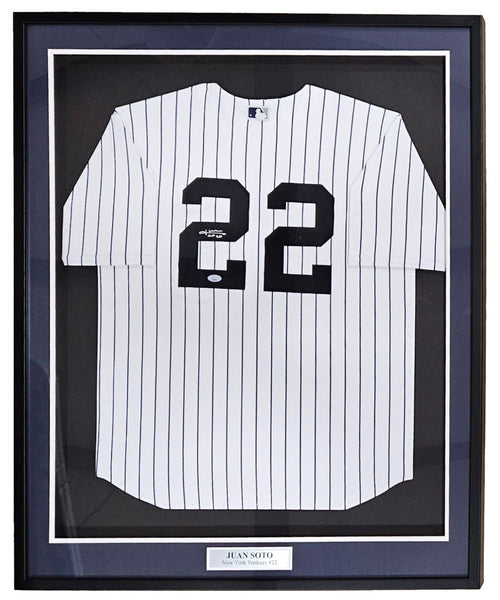 Featured is a Juan Soto signed New York Yankees Nike Limited replica jersey. This ball has been hand signed by Soto and comes with the JSA hologram and certificate of authenticity. This jersey is size XL. This jersey has been professionally framed and matted and is approximately 32x42. This ball would make a great addition to any sports memorabilia collection!. SPECIFICATIONS Autographed By: Juan Soto Team: New York Yankees Sport: Baseball Authentication: James Spence Authentication (JSA)