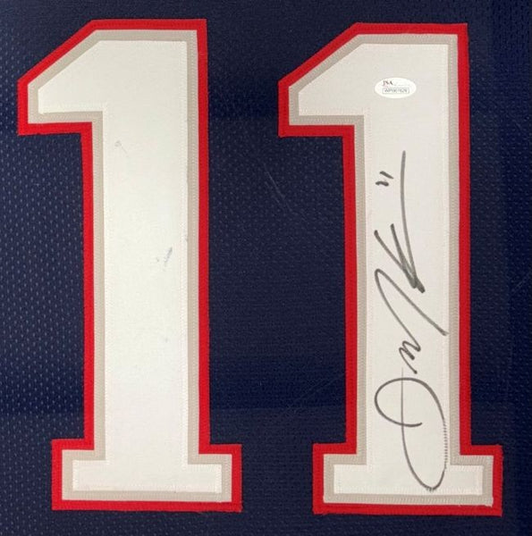 Featured is a Julian Edelman signed custom football jersey. This jersey has been hand signed by Edelman and comes with the JSA witnessed hologram. This jersey has been professionally framed and matted and is approximately 32x38. This jersey features professionally sewn letters and numbers and is size XL. This jersey has no team tags or emblems and is intended as a sports collectible. This jersey would make a great addition to any sports memorabilia collection! SPECIFICATIONS Autographed By: Julian Edelman Team: New England Patriots Sport: Football Authentication: James Spence Authentication (JSA)