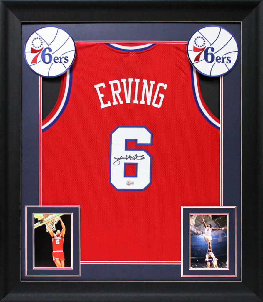 This Autographed Red Pro Style Framed Jersey has been Personally Signed by Julius "Dr. J" Erving of the Philadelphia 76ers. This item is 100% Authentic to include a hologram by Beckett Authentication Services. This item may come with the new Beckett Authentication hologram that has a scannable QR code rather than the traditional COA. If you would like to have a COA, you are welcome to reach out to Beckett for a printed certification once you receive your item. We conducted an autograph signing with Julius "Dr. J" Erving where multiples of the same item were signed. While the photographs are representative of this item, the size, placement and strength of the signature may vary. Each item is hand signed, therefore, each autograph is unique. This item can be verified through BAS. This item has been professionally framed to overall dimensions of approximately 32 x 37 inches. This is a X-Large sized, non-branded, custom-stitched Framed Jersey. These jerseys are framed to order, it takes approximately 3-4 business days for framing to be completed.
