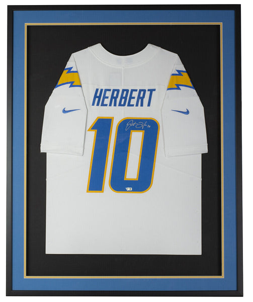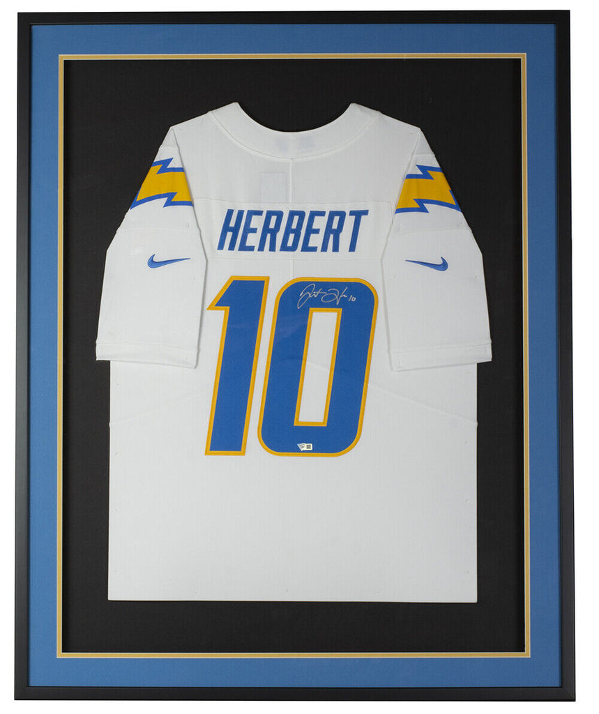 Featured is a Justin Herbert signed Los Angeles Chargers Nike football jersey. This jersey was hand signed by Herbert and comes with the Fanatics hologram and certificate of authentication. This jersey has been professionally framed and matted and is approximately 32x38. This jersey would make a great addition to any sports memorabilia collection. SPECIFICATIONS Autographed By: Justin Herbert Team: Los Angeles Chargers Sport: Football Authentication: Fanatics Authentic
