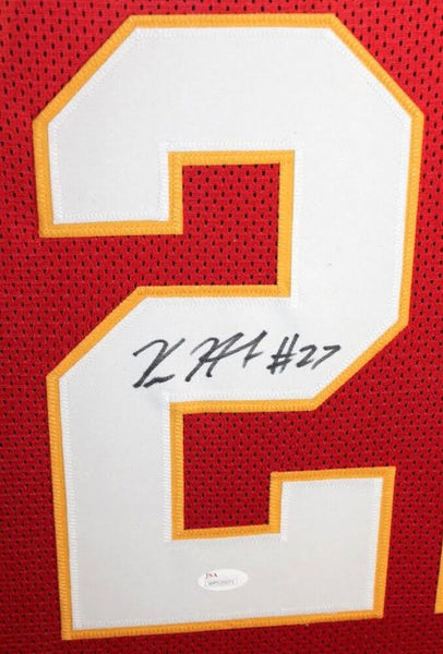 Custom frame measures approximately 35" x 43" in size and features a jersey which has been hand-signed in black felt-tip pen by Kareem Hunt. The autograph includes an official James Spence Authentication (JSA) hologram and matching COA for authenticity purposes. The signing of this item was witnessed by JSA.Authentication: JSA COA