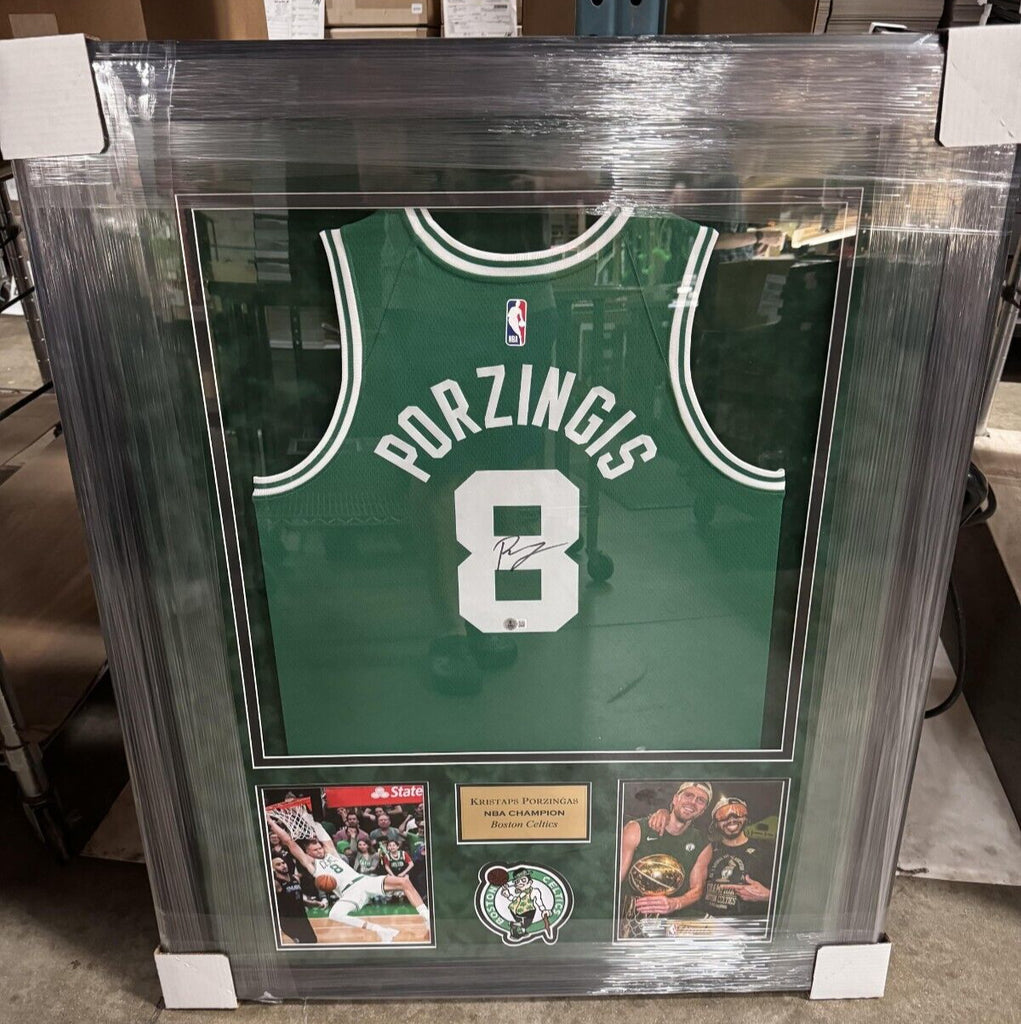 This jersey custom framed to 32x40 has been personally hand signed by Kristaps Porzingis of the Boston Celtics100% authenticCertificate of authenticity by BeckettNBA Champion Plaqueasgmemorabilia.comExact location of signature may vary