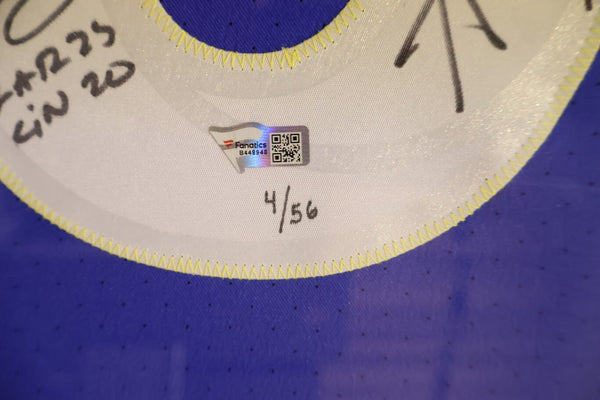 Matthew Stafford & Rams Stars Super Bowl LVI Championship JerseyThis stunning framed Nike Los Angeles Rams jersey features Matthew Stafford's signature along with Cooper Kupp, Aaron Donald, Von Miller, Cam Akers, and Andrew Whitworth, all with special inscriptions commemorating their Super Bowl LVI victory.Player Signatures & Inscriptions: Matthew Stafford - Super Bowl LVI champion quarterback Cooper Kupp - "SB LVI MVP" inscription Aaron Donald Von Miller Cam Akers - "SB LV1 Champs" inscription Andrew Whitworth What Makes This Special: Limited Edition #4 of 56 - Extremely rare collectible Fanatics Authenticated - Official Certificate of Authenticity Super Bowl LVI Photo Collage - Professionally framed with championship photos Championship Team Signatures - Six key players from the Super Bowl LVI victory Professionally framed with Super Bowl LVI photo collage -- the ultimate collector's piece for Rams fans! Limited Edition #4 of 56, authenticated by Fanatics.