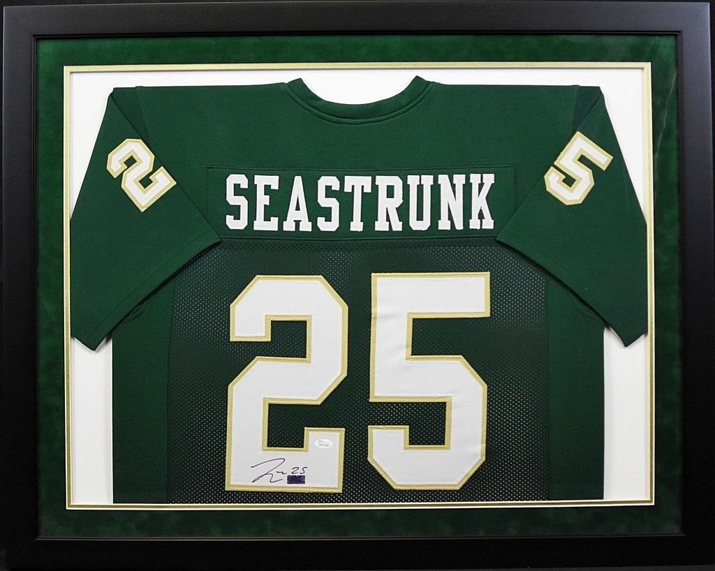 Lache Seastrunk, former star running back for the Baylor Bears, has hand signed this green custom jersey. Jersey is size XL and all letters/numbers are sewn-on. It comes professionally framed in a black wood frame and double matted in Baylor Bears colors. This item comes with a certificate of authenticity (COA) from Signature Sports Marketing, one of the leaders in the industry. You will receive a paper COA along with matching serial-numbered holograms.Item pictured may not be the exact item you will receive. It will be similar quality, and we guarantee your satisfaction.