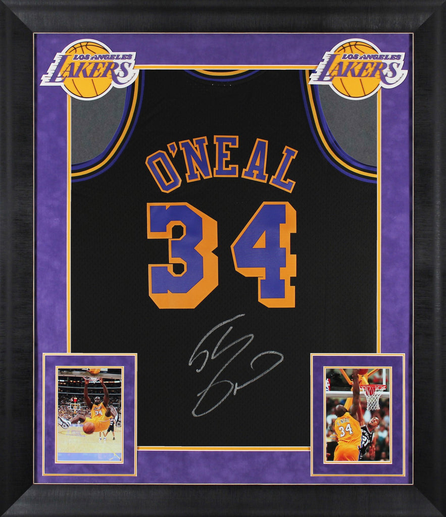 This Autographed Black Mitchell & Ness 1996-97 Throwback Hardwood Classics Swingman Framed Jersey has been Personally Signed by Shaquille O'Neal of the Los Angeles Lakers. This item is 100% Authentic to include a hologram by Beckett Authentication Services. This item will come with an affixed Beckett Authentication Services (BAS) authentication sticker, which includes a scannable QR code to verify authenticity. Please note that Beckett no longer provides serial-numbered COA cards, and the attached BAS sticker will serve as the complete authentication for this item. This is a BAS Witnessed Protection Program item which means a Beckett Authentication Service representative was present when this item was being signed. We conducted an autograph signing with Shaquille O'Neal where multiples of the same item were signed. While the photographs are representative of this item, the size, placement and strength of the signature may vary. Each item is hand signed, therefore, each autograph is unique. This item can be verified through BAS Witnessed. This item has been professionally framed to overall dimensions of approximately 32 x 37 inches. This is a X-Large sized Framed Jersey. This jersey will be framed to order, it will take approximately 3-4 business days from purchase date for it to ship.